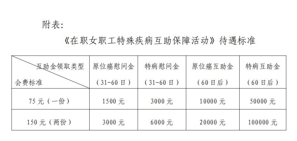 在活动生效60日(不含)后,会员首次确诊12种女职工特殊疾病对应的一种或多种原位癌时,可以一次性领取互助金10000元/份,同一保障期内,因患不同原位癌病种,可多次领取原位癌互助金,累计领取总额最高为50000元/份,保障活动待遇终止。