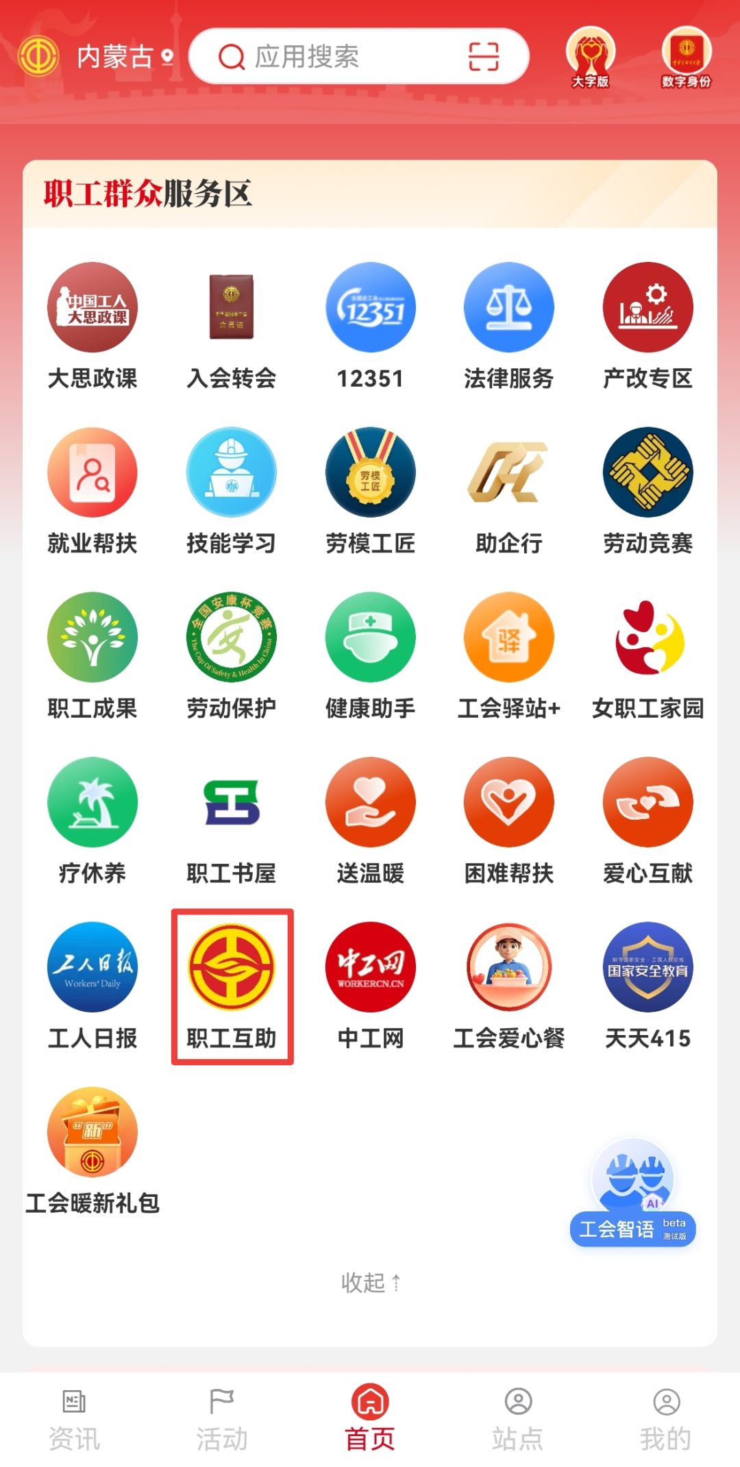 2.注册登录后点击首页下滑至“职工互助”