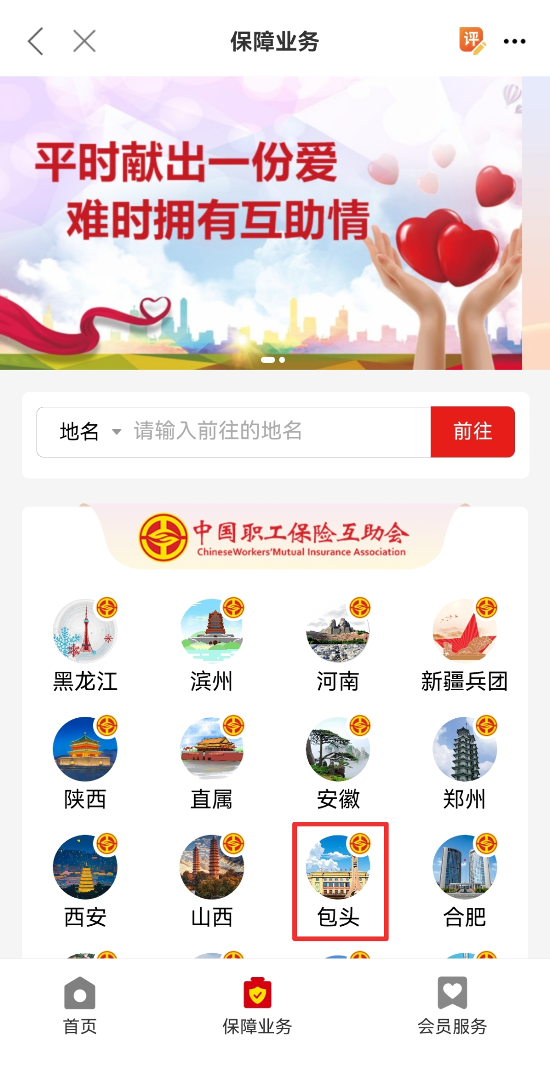 3.点击“职工互助”选择所属地区“包头”