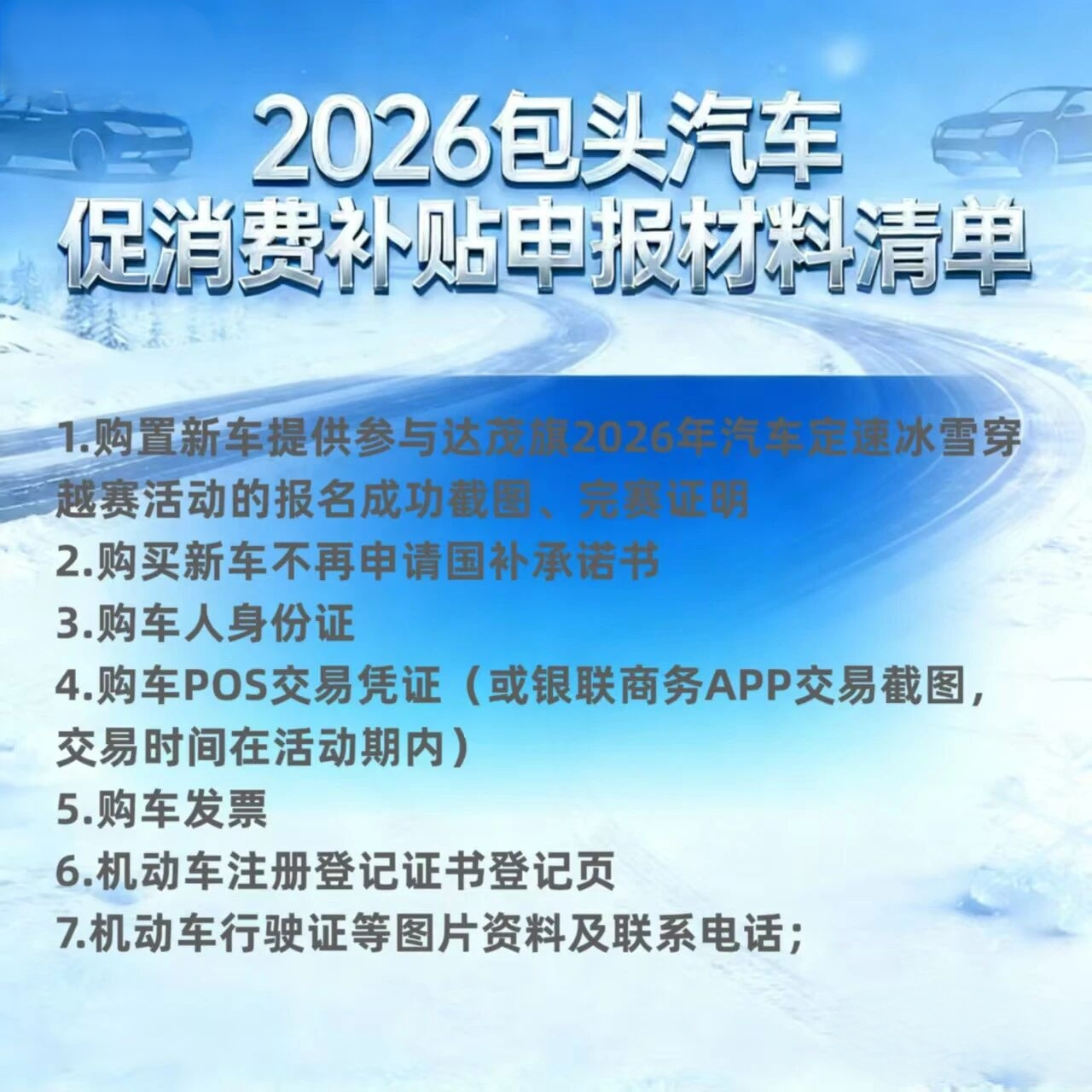 2. 补贴对象:对参加达茂旗2026年汽车定速冰雪穿越赛活动的个人消费者,在活动期间在本地车企线下门店或赛道活动现场,购买乘用车新车(非营运、小微型载客汽车),开具我市《机动车销售统一发票》的个人消费者(户籍不限,公司、企业等营运机构不可享受购车补贴),每位消费者限享受1辆汽车的消费补贴,同一新购置车辆只能使用1次消费补贴。活动期间,购车人新购置车辆不可同时享受2026年国家汽车报废更新补贴或汽车置换更新补贴。