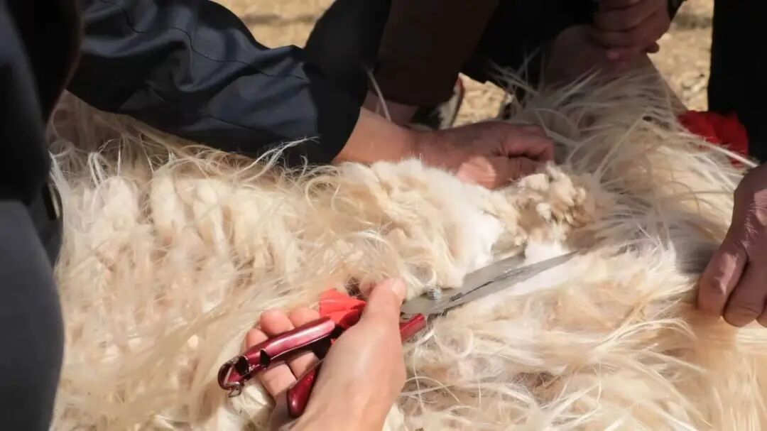 4月15日上午,达茂旗达尔汗苏木阿拉腾敖都嘎查绒山羊养殖基地内一派繁忙景象,洁白的绒山羊时而低头觅食,时而欢快奔跑、相互追逐,清脆的咩叫声与电动剪毛机的嗡嗡声交织在一起,构成了一幅鲜活的草原养殖画卷。工作人员动作娴熟地固定绒山羊,小心翼翼地修剪绒毛,雪白蓬松的羊绒簌簌落下,一只体型不算大的绒山羊,一次性剪下3.8斤羊毛。