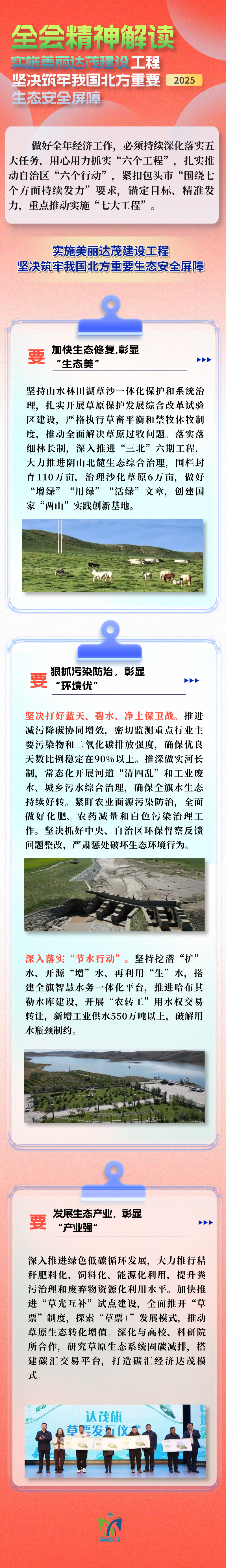 为进一步贯彻落实包头市委十三届九次全会暨全市经济工作会议精神,达茂旗上下切实把思想和行动统一到全会要求上来,锚定目标、精准发力,2025年坚持稳中求进、守正创新、干字当头,以进一步全面深化改革为动力,强化增量意识、树立“有解思维”,着力破解制约高质量发展的堵点难点,不断提高人民生活水平,重点推动实施“七大工程”。“英雄达茂”公众号以长图形式解读“七大工程”。